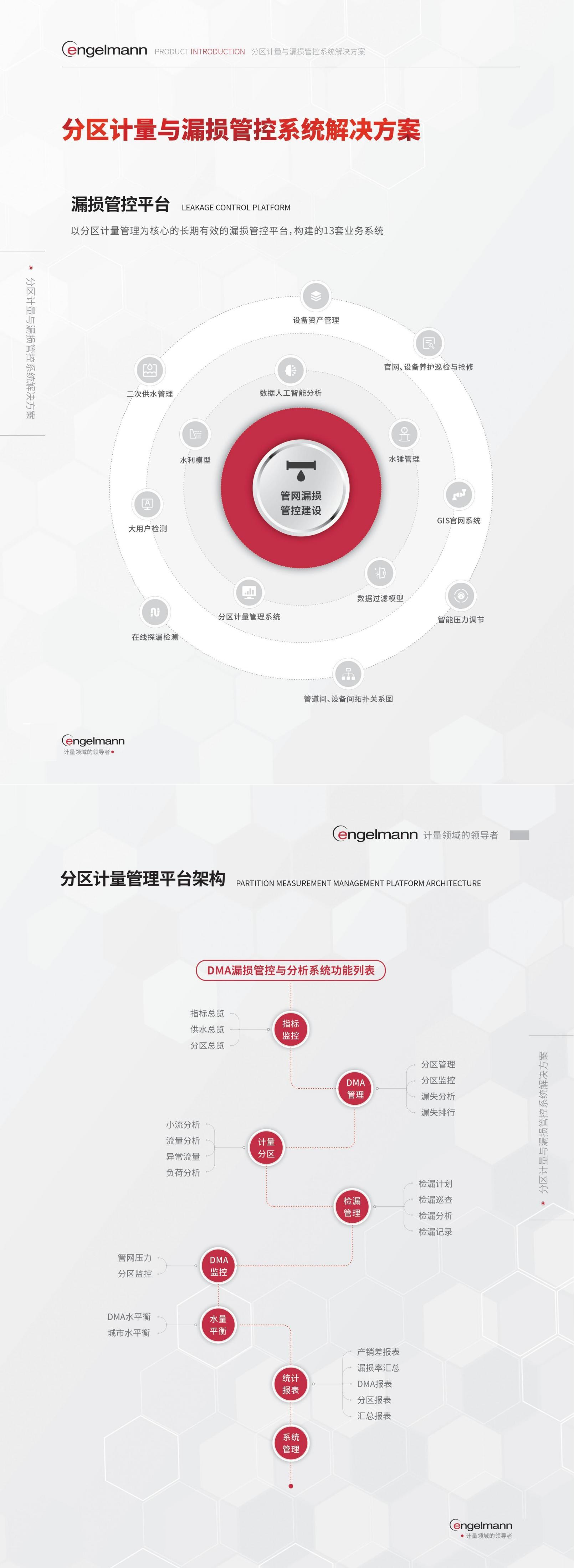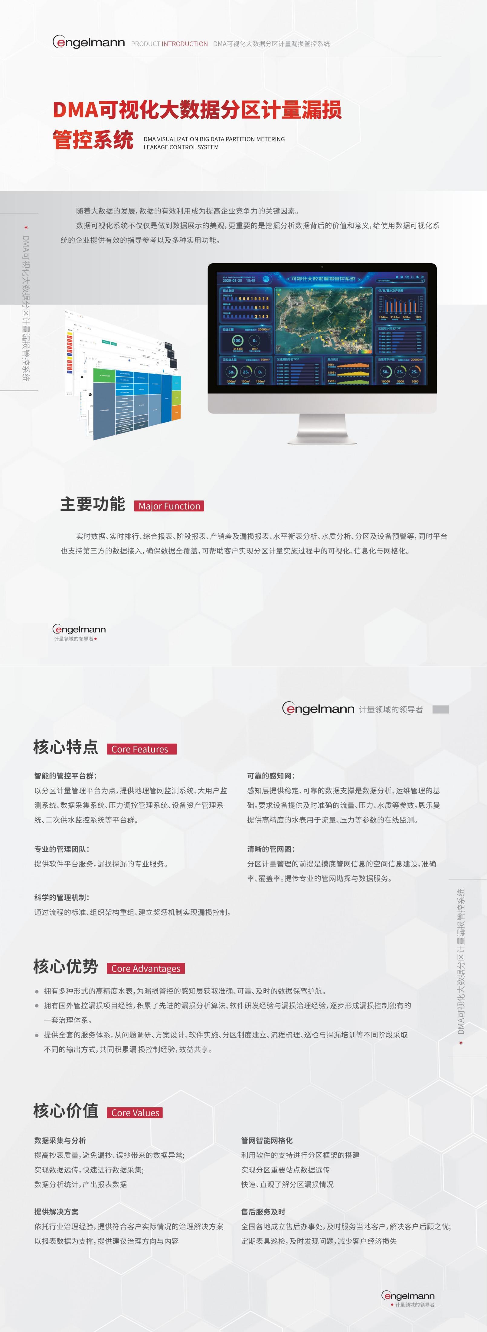 產品描述:實時數據、實時排行、綜合報表、階段報表、產銷差及漏損報表、水平衡表分析、水質分析、分區及設備預警等,同時平台也支持第三方的數據接入,確保數據全覆蓋,可幫助客戶實現分區計量...