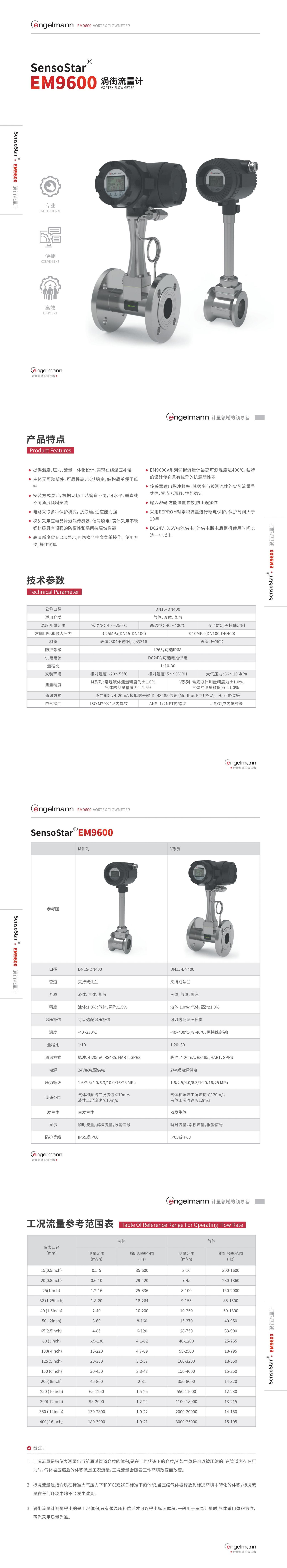 產品描述:Englemann EM9600型渦街流量計根據選型不同可以實現以下功能:測量工業管道介質流體的溫度、壓力、瞬時流量和累計流量等參數,並具有脈衝輸出、4-20mA 模擬信號輸出、RS485 通訊(Modbus RTU 協議...