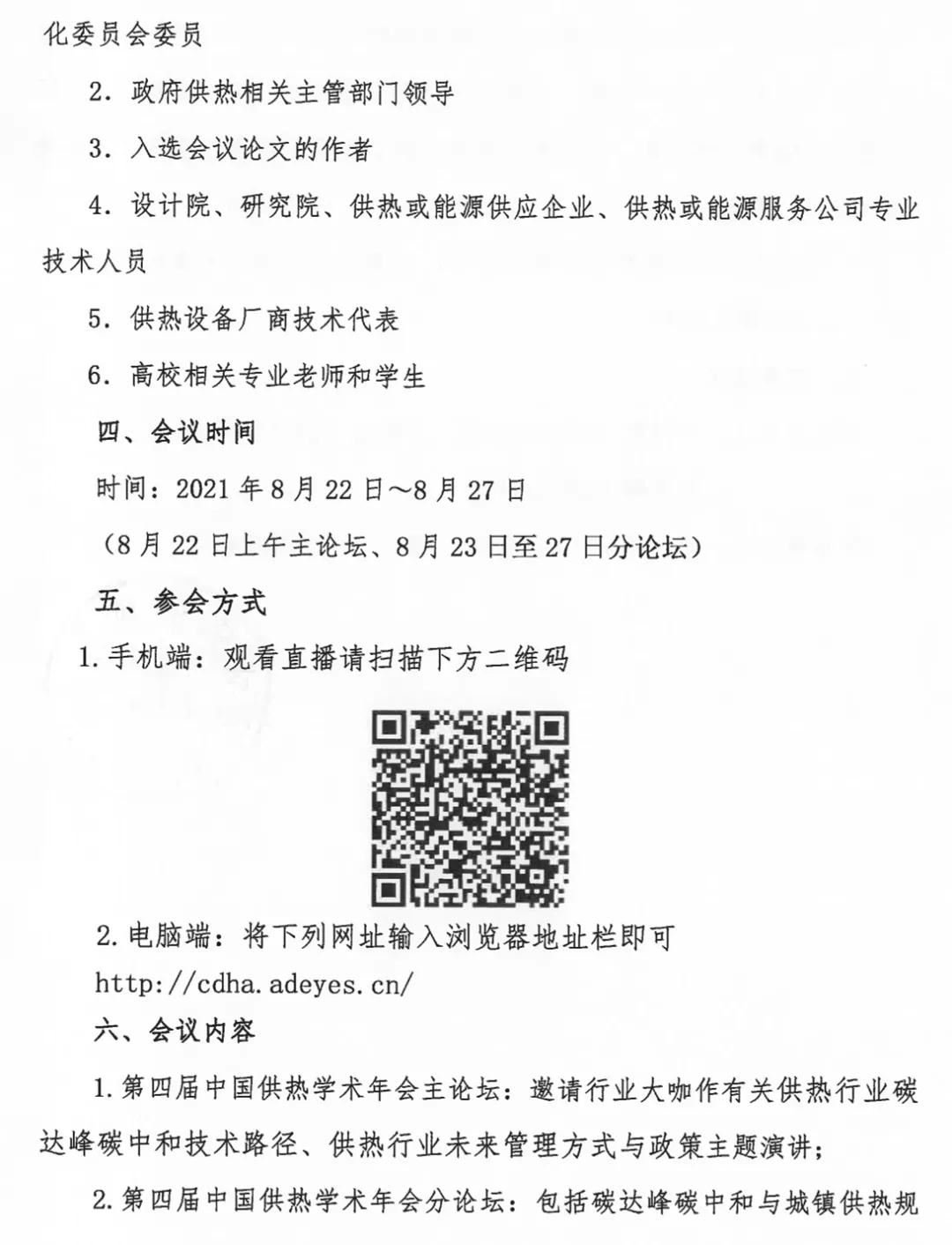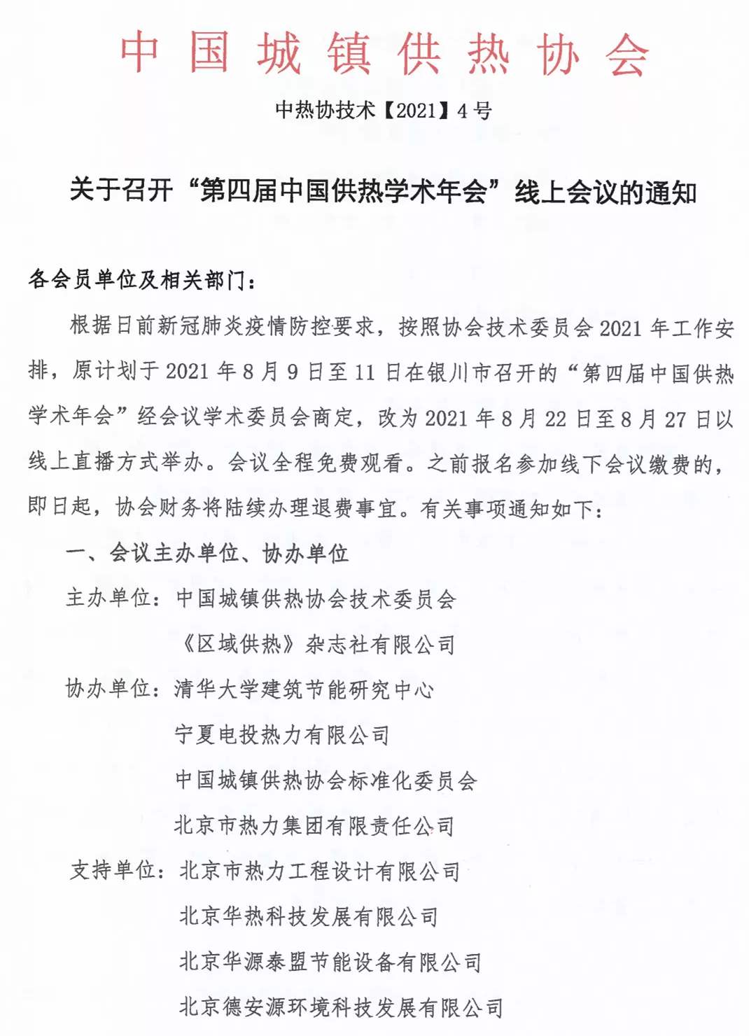 根據日前新冠肺炎疫情防控要求,按照協會技術委員會2021年工作安排,原計劃於2021年8月9日至11日在銀川市召開的“第四屆中國供熱學術年會”經會議學術委員會商定,改為2021年8月22日至8月27日以線上直播方式舉辦。會議全程免費觀看。之前報名參加線下會議繳費的,即日起,協會財務將陸續辦理退費事宜。有關事項通知如下: