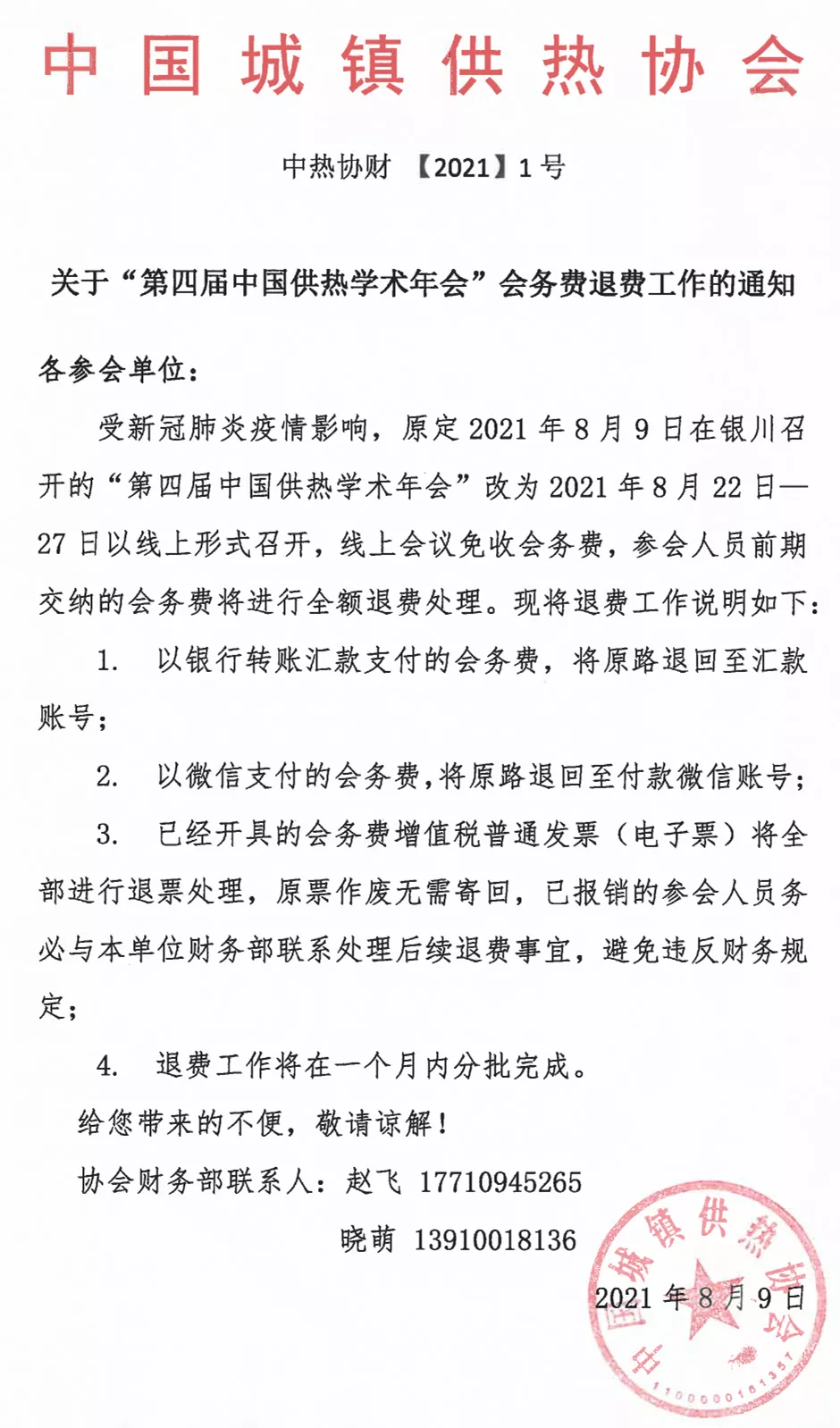 受新冠肺炎疫情影響,原定2021年8月9日在銀川召開的“第四屆中國供熱學術年會”改為2021年8月22日—27日以線上形式召開,線上會議免收會務費,參會人員前期交納的會務費將進行全額退費處理。現將退費工作說明如下: